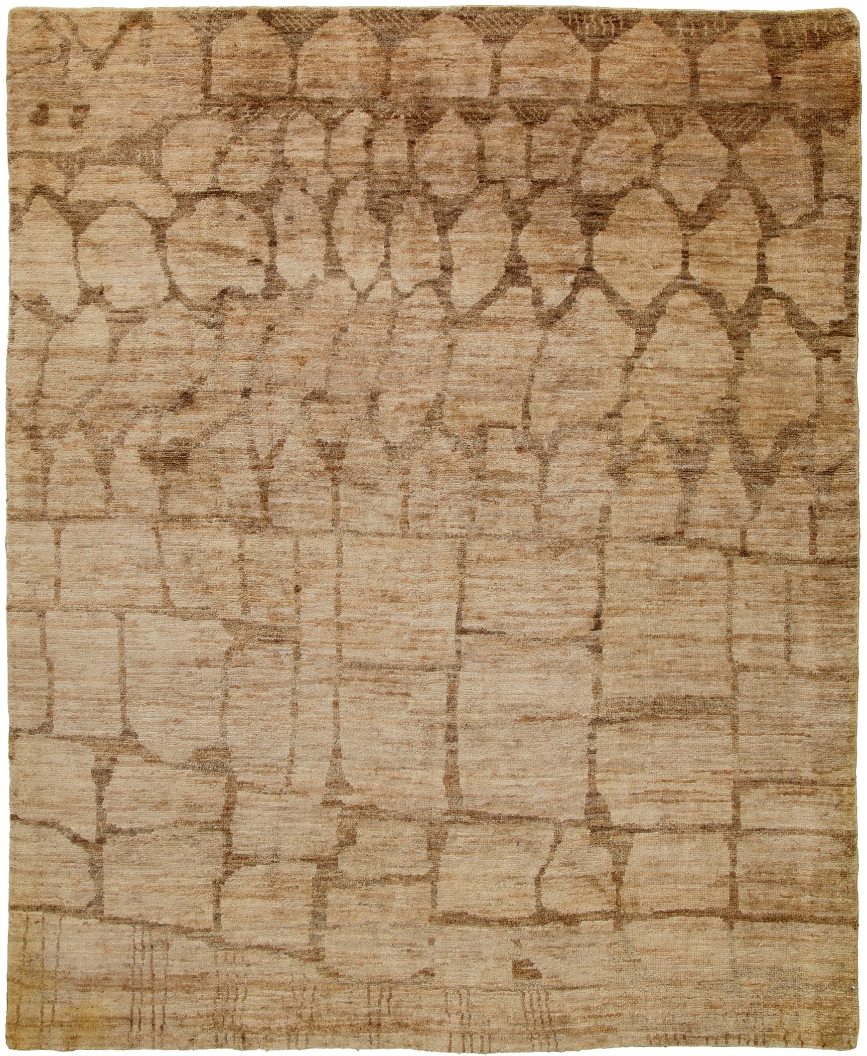 All wool hand knotted rug woven in Pakistan by Afghan weavers. Colors are soft tans, browns. I see a Vermont stone wall!