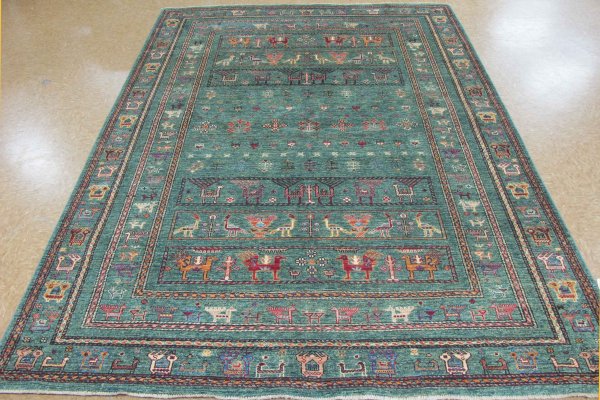 All wool hand knotted rug woven in Afghanistan. Color is Teal Green. Tribal pattern rug.