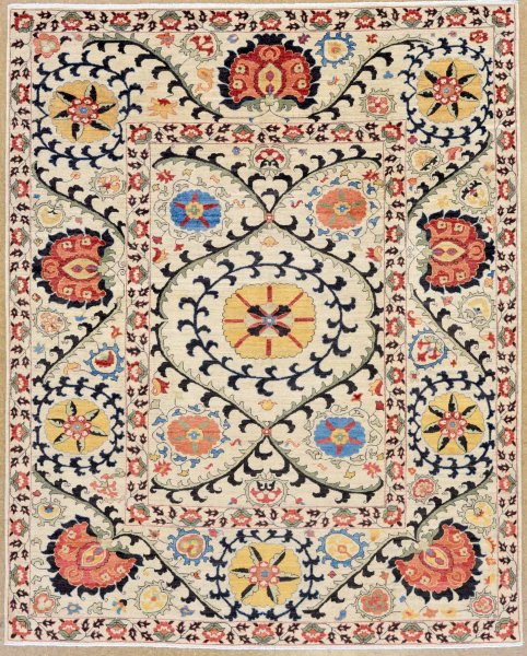 Afghan Tribal Suzani rug all wool hand knotted rug woven in Afghanistan. Each rug is unique with white or off white or golden background colors, call me for availability.