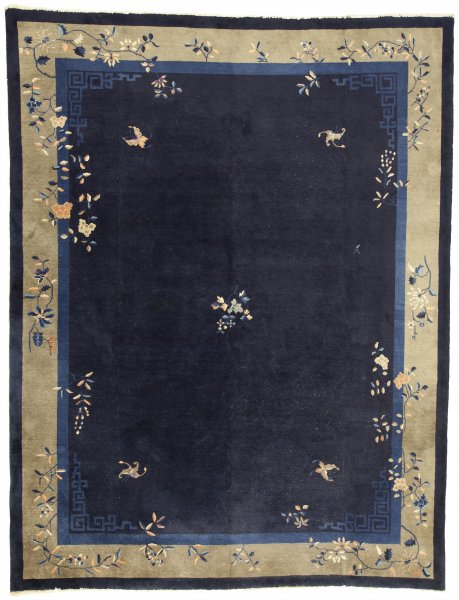 All wool hand knotted antique Chinese rug, woven in China. Colors are Dark blue and Ivory.