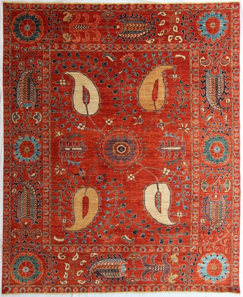 100% Afghan wool, hand knotted rug woven in Pakistan by Afghan weavers. Close cut carpet, 100 knots psi.