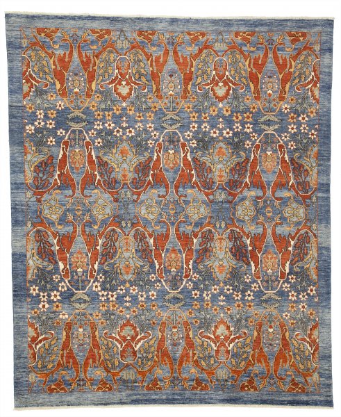 100% Afghan wool, hand knotted rug woven in Pakistan by Afghan weavers. 100 knots psi. Close cut carpet.