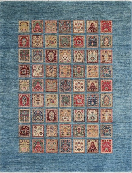 All wool hand knotted rug. colors are Light Blue, Multi-colored squares in this gabbeh rug from Afghanistan. Cost at $36 sq ft . Call me for size availability.