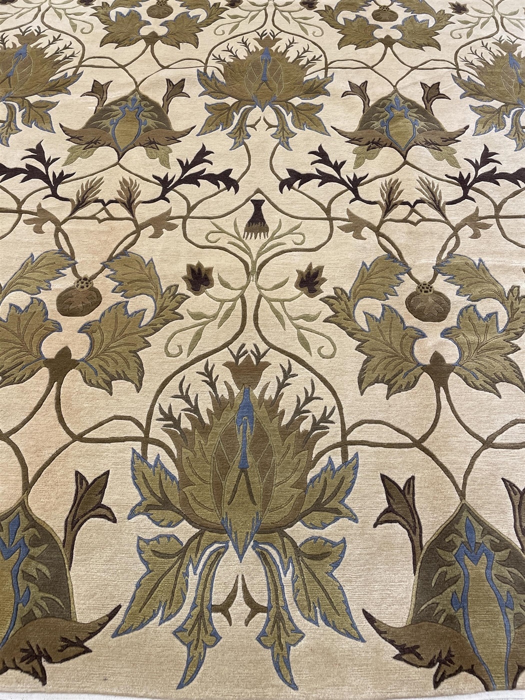 Tibetan rug woven in Nepal Arts and Crafts design. White background with gray and taupe some blue outlining the floral pattern. Medium to deep soft pile. Call me for the overall image, this is a close up of the rug.